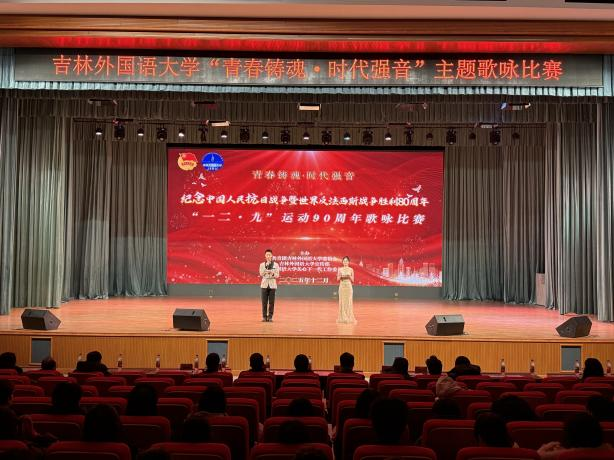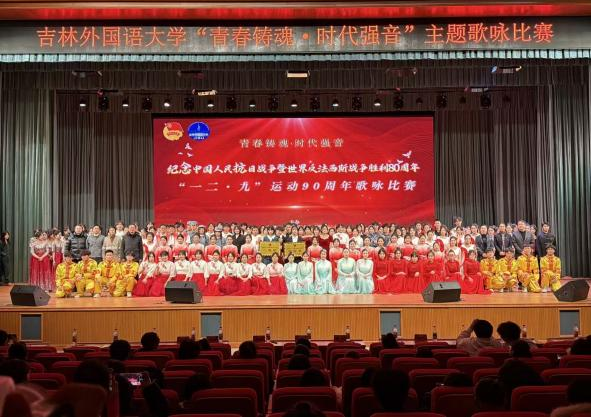 12月10日下午,吉林外国语大学在世桥大厦报告厅举办“青春铸魂·时代强音——纪念中国人民抗日战争暨世界反法西斯战争胜利80周年‘一二·九’运动90周年”歌咏比赛。吉林外国语大学研究生院组织全校70名研究生参加比赛,高级翻译学院32位、马克思主义学院28位研究生们分别组队参赛。